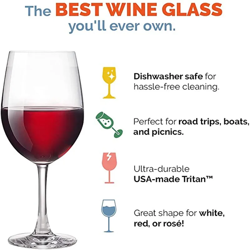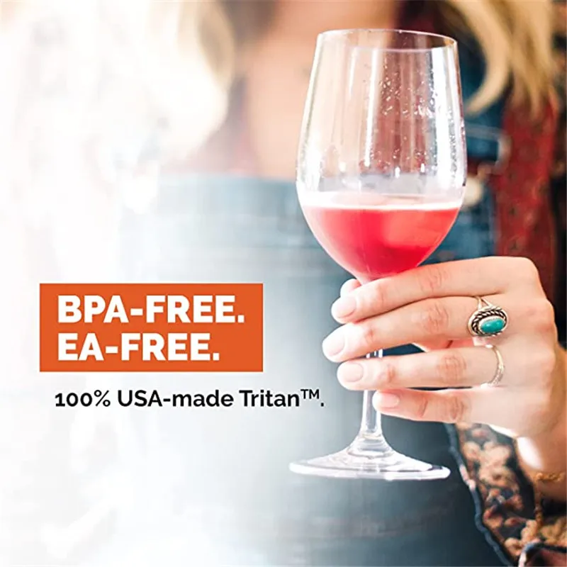 Safety--NON-TOXIC! Made With 100% USA Made Premium Material Tritan Plastic, Not only is a BPA-free plastic wine glasses, it doesn’t contain BPS (bisphenol S) or any other bisphenols. Combine that with shatter resistance, and you’ve got a tough plastic that is safe enough to trust with your family.