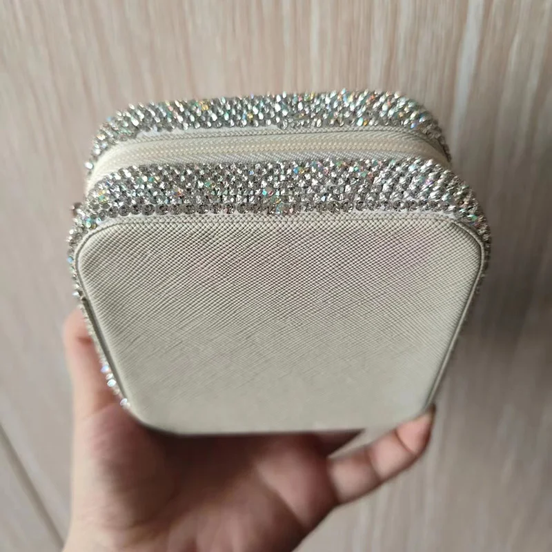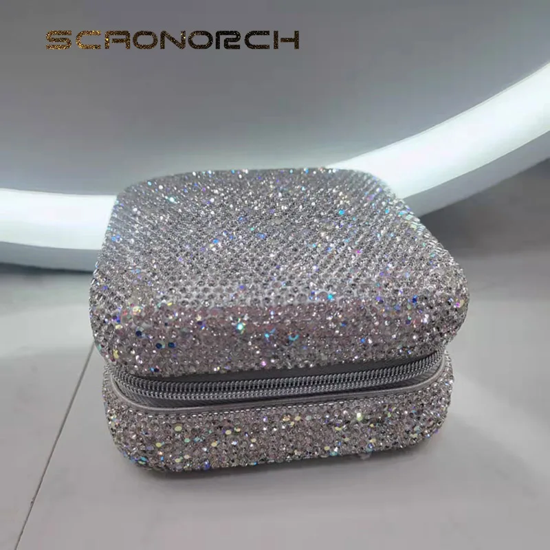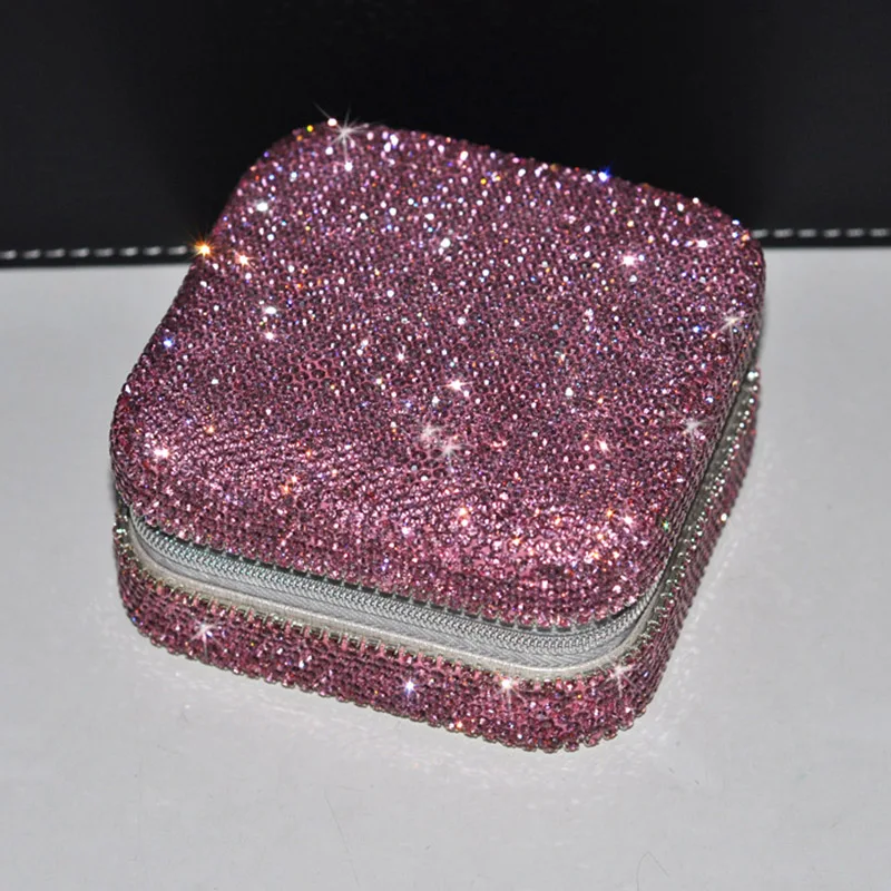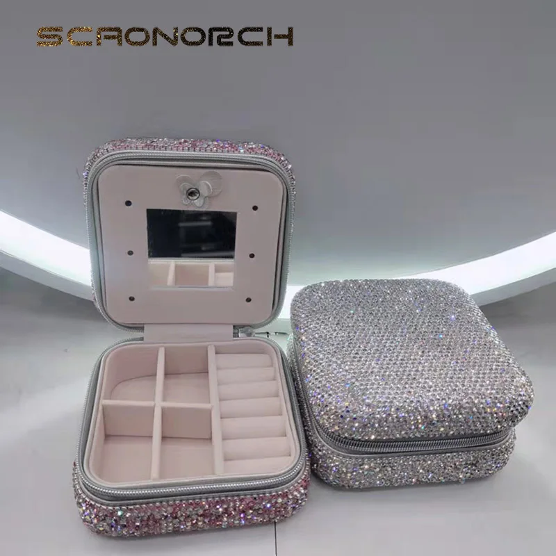 Bling Rhinestone Jewelry Box Case Makeup Organizer Dresser Display Cabinet Travel Portable Leather Partition Storage Box